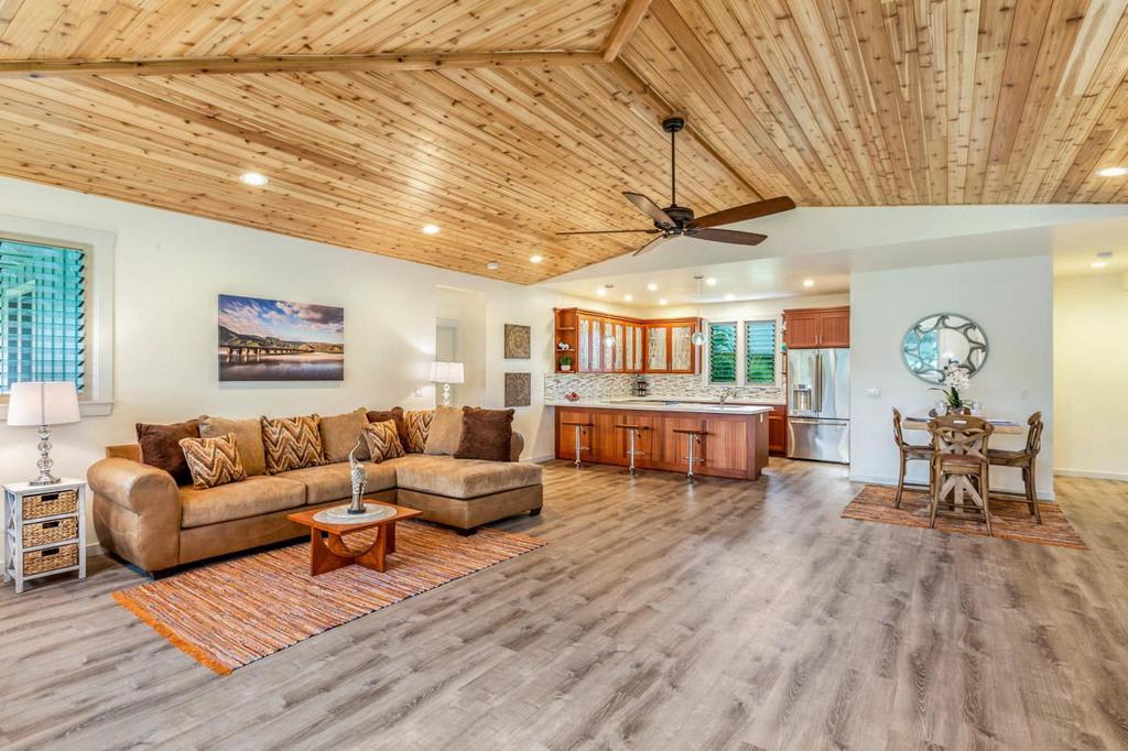 This successful, County of Kauai Approved TVRNCU #1086, vacation rental is a recently remodeled, 2-bedroom, 2.5 bath bungalow nestled on the bank of the Waioli River. The welcoming, open concept living space has exposed beam ceilings, hardwood floors, and lots of natural light. The modern kitchen features stainless steel appliances, granite countertops, and cherry cabinets. En suite bathrooms complement the two, large bedrooms. Relax and dine on the covered lanai after taking a refreshing, outdoor shower.