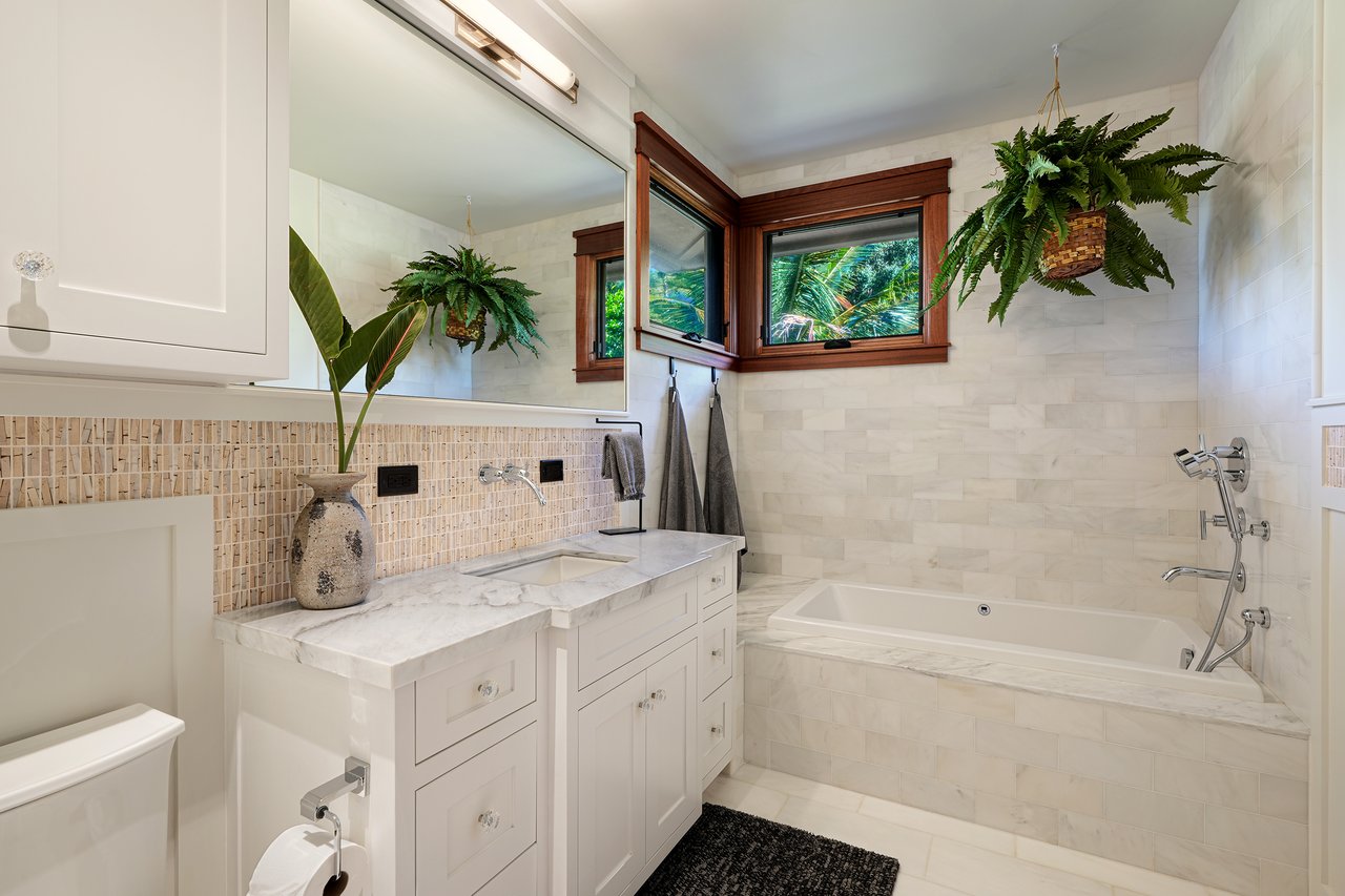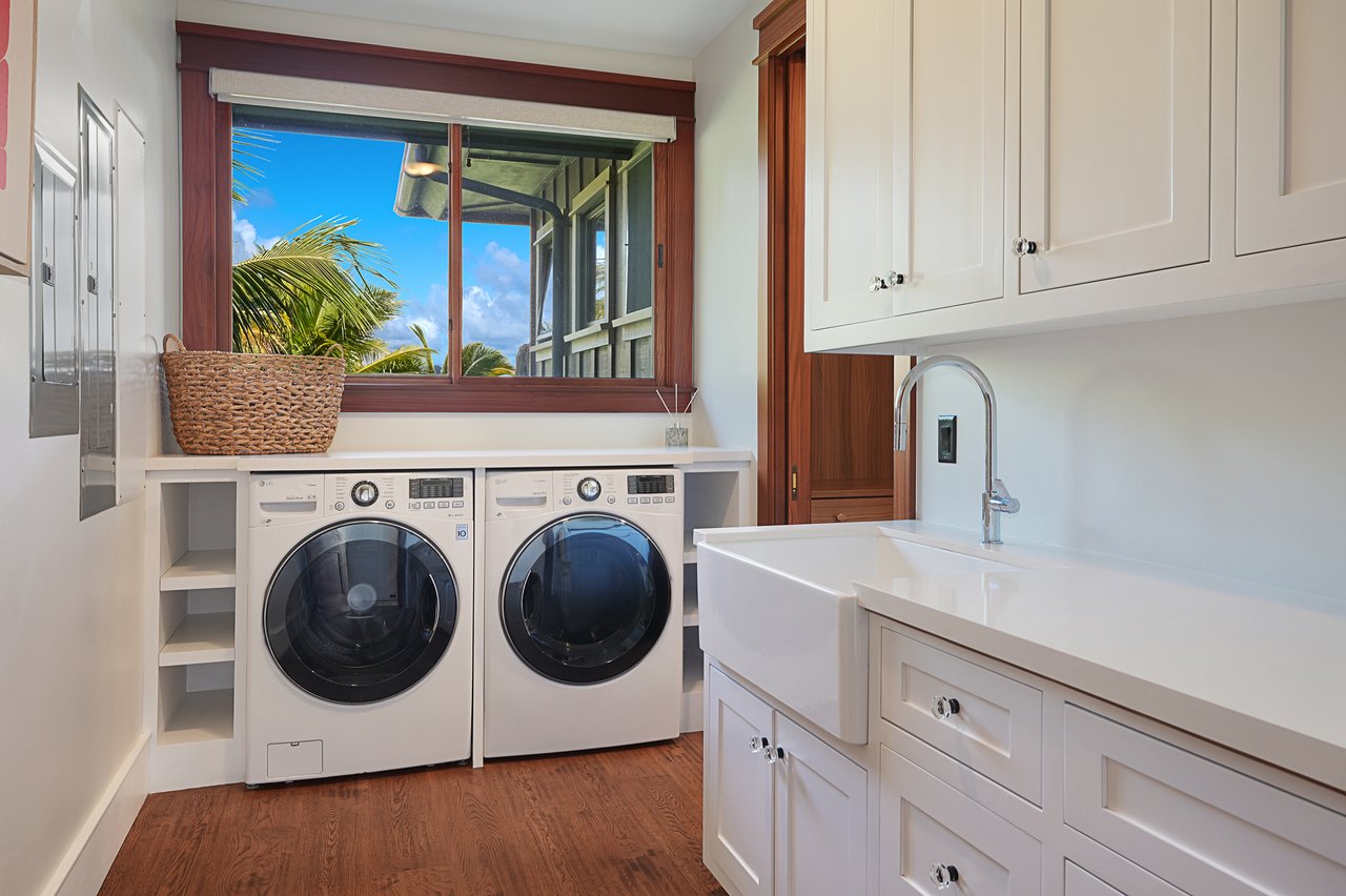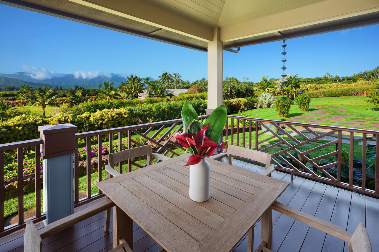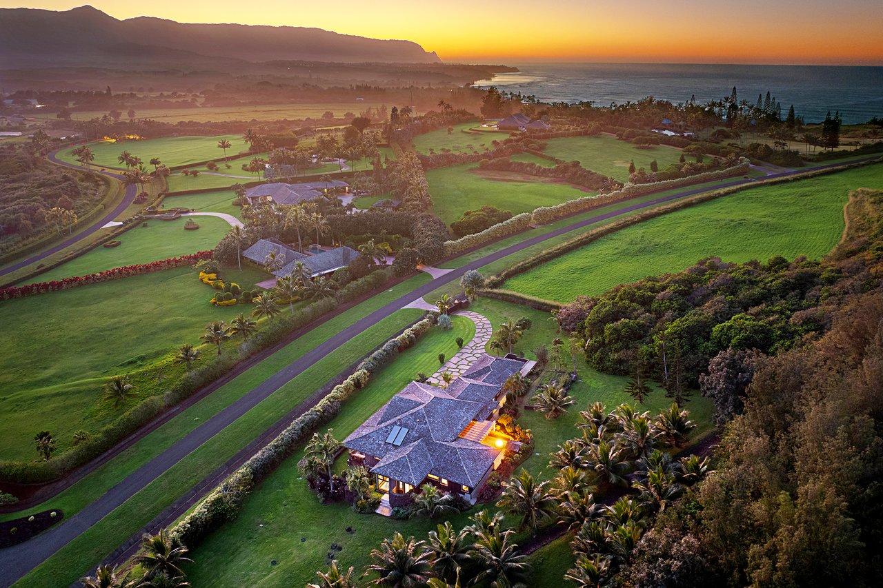 The 5.25 acres reveal a living tapestry with lava rock walls, fragrant fruit trees and colorful tropical species. A Samoan coconut grove is the threshold between cultivated beauty and the protected wilderness sanctuary at the neighboring Kilauea Point National Wildlife Refuge.