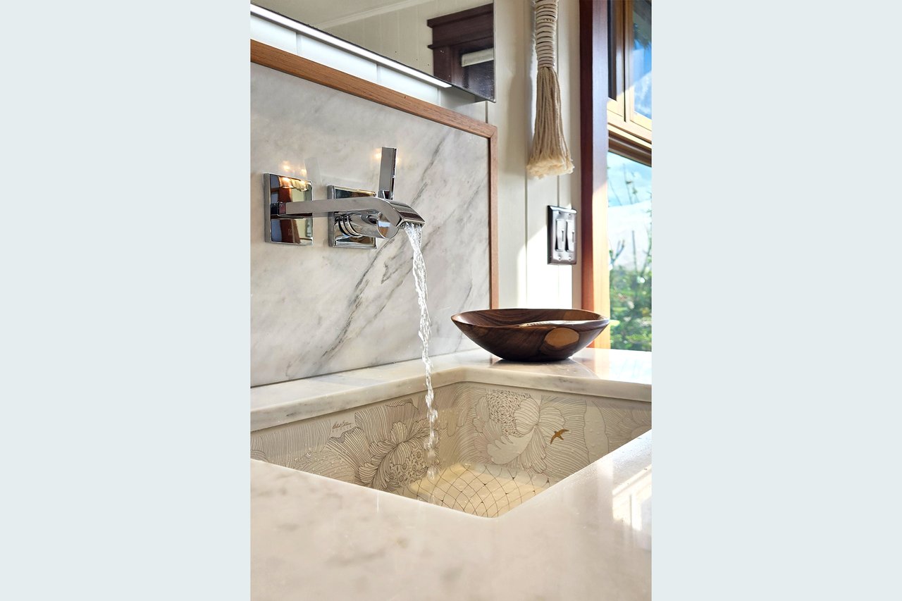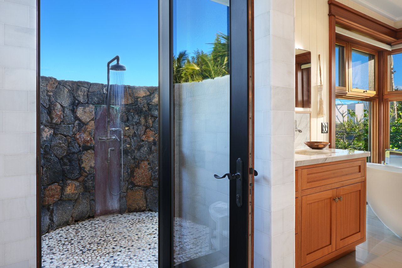 Outdoors, life unfolds across the various shaded lanais - evening gatherings around the fire pit and wood-fired pizza oven and afternoons spent capturing sea-borne trade winds rising from the valley.