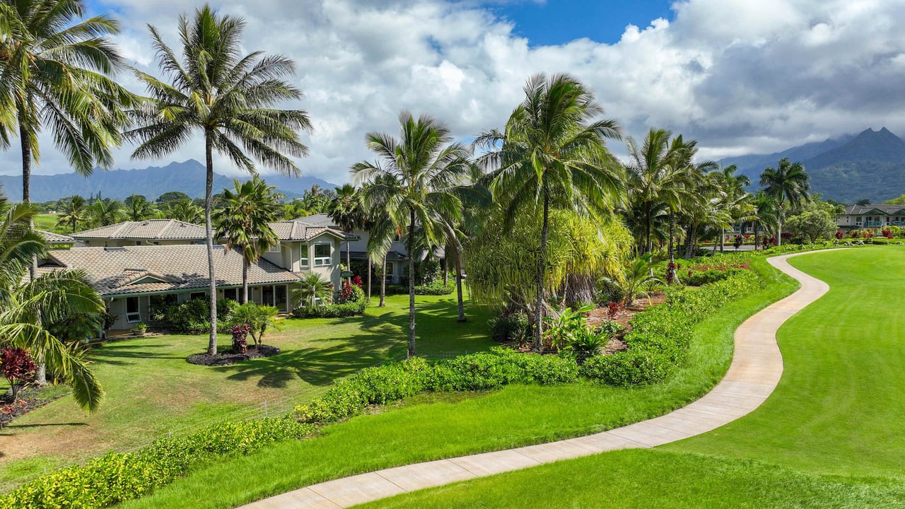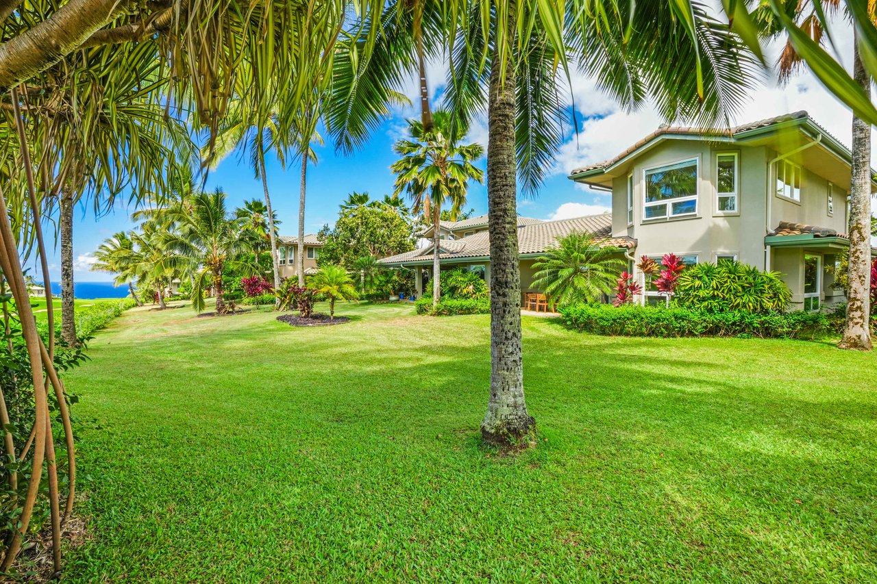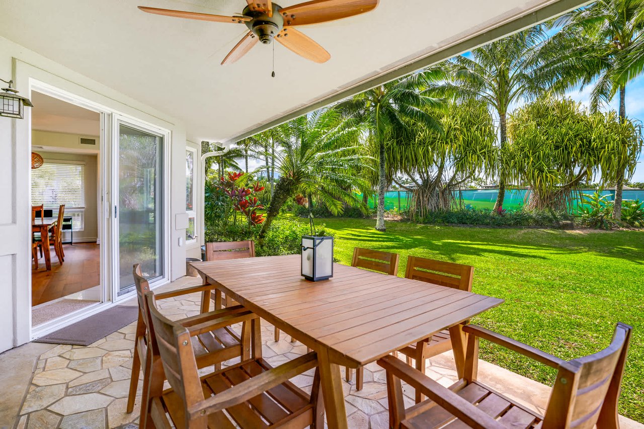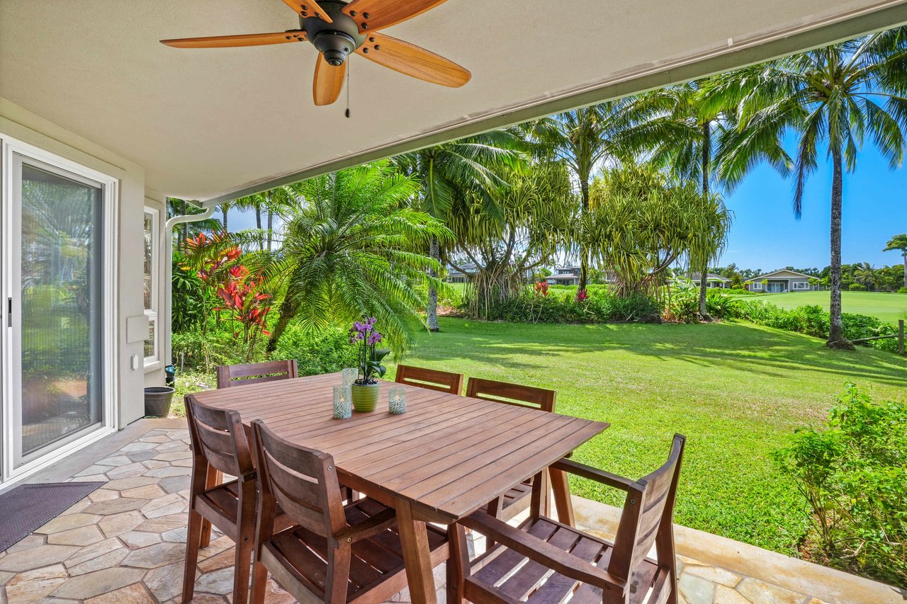 The lanai opens to a wide swath of verdant lawn creating a generous retreat providing private outdoor living and entertaining. Enjoy the sunset views filtered through the lush landscaping fronting the newly renovated Prince Golf Course. In the distance, you can see and hear the crashing waves at Anini Reef.