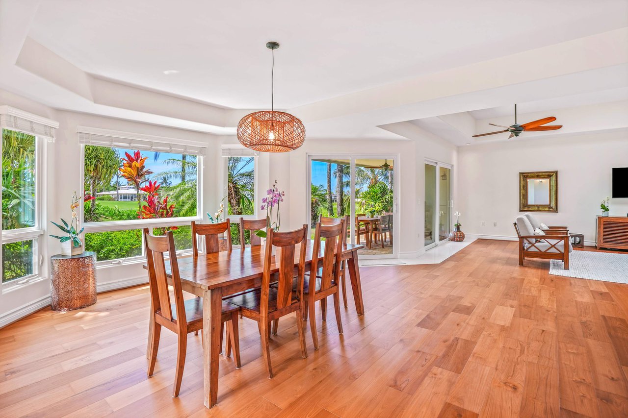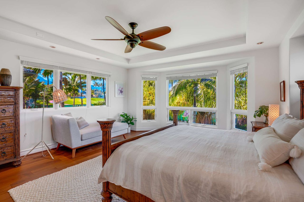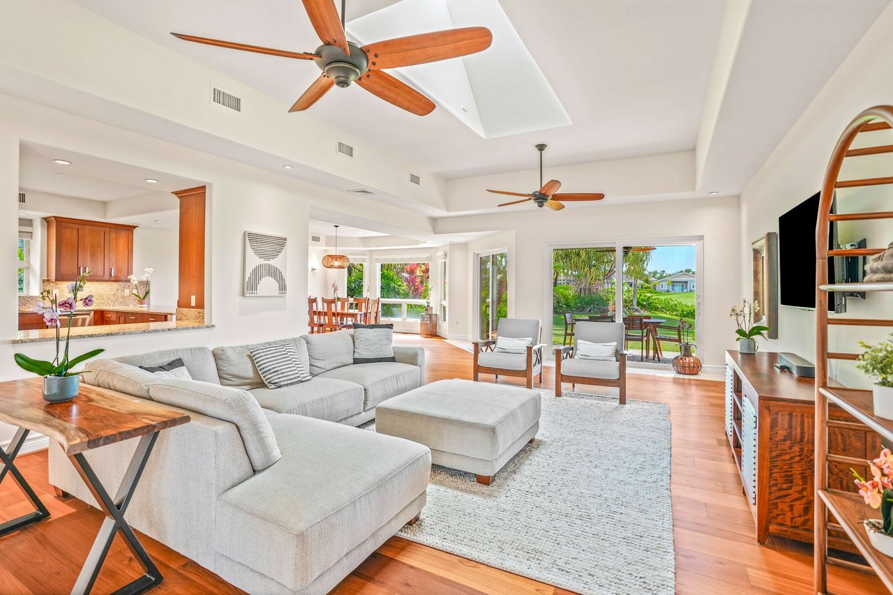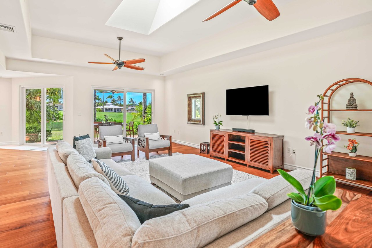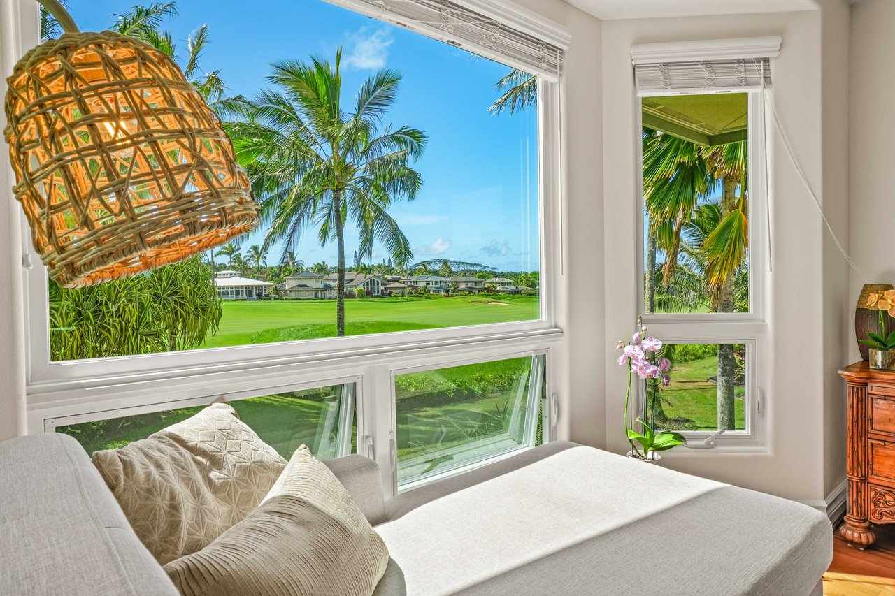 The lanai opens to a wide swath of verdant lawn creating a generous retreat providing private outdoor living and entertaining. Enjoy the sunset views filtered through the lush landscaping fronting the newly renovated Prince Golf Course. In the distance, you can see and hear the crashing waves at Anini Reef.