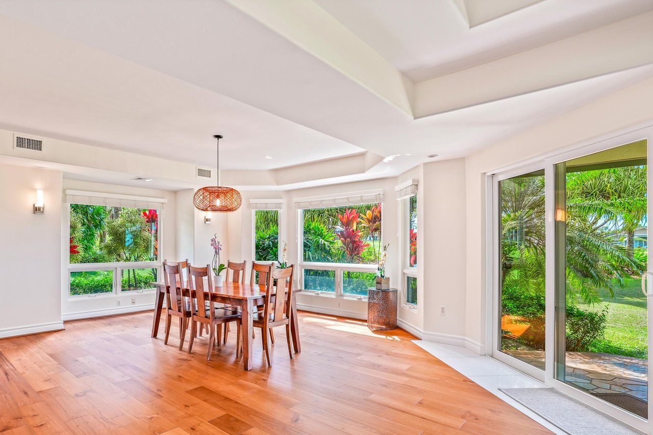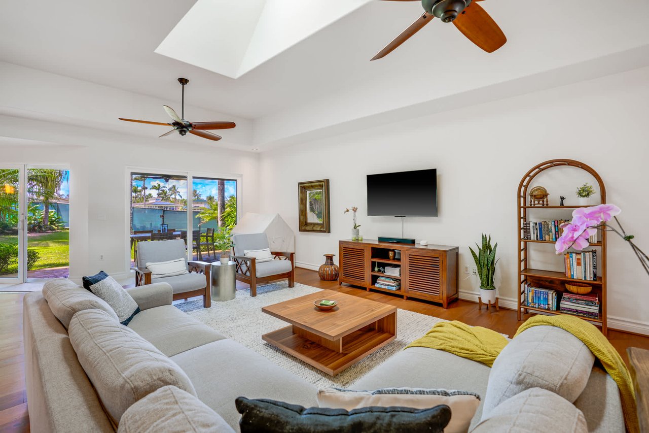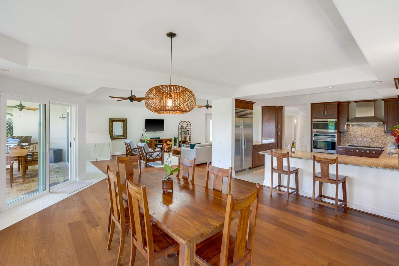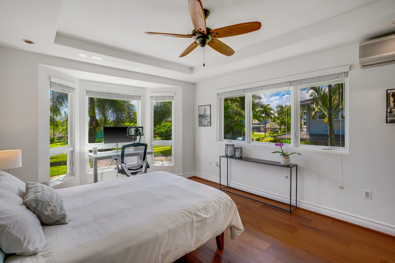 The lanai opens to a wide swath of verdant lawn creating a generous retreat providing private outdoor living and entertaining. Enjoy the sunset views filtered through the lush landscaping fronting the newly renovated Prince Golf Course. In the distance, you can see and hear the crashing waves at Anini Reef.